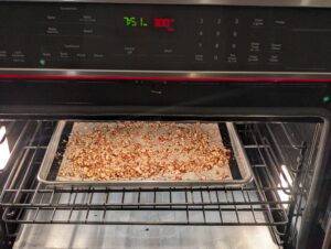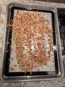 Chop the nuts coarsely on a cutting board using a large butcher knife. Put the nuts on a silicone mat on a cookie sheet.