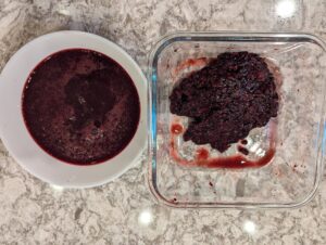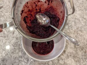 - Use strainer and rubber spatula or metal spoon to separate berry juice from pulp. Set pulp aside.