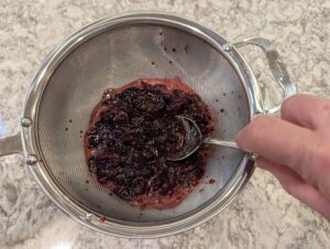 - Use strainer and rubber spatula to separate cherry juice from pulp. Reserve cherry pulp for later.