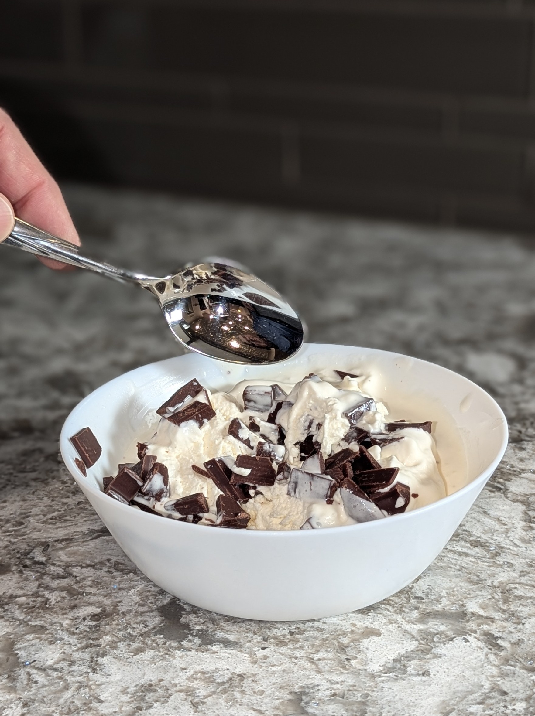Homemade vanilla ice cream sprinkled with chocolate chips that melt in your mouth. Mmmmm!