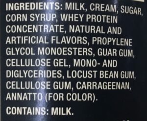 Some typical additives include guar gum, xanthan gum, carrageenan, whey protein, propylene glycol monoesters, cellulose gel, mono- and diglycerides, locust bean gum, carob bean, polysorbate, tapioca starch, high fructose corn syrup, tara gum, soy lecithin, etc.