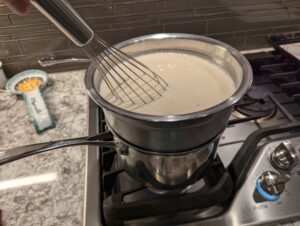 Put in double boiler with ~3/4” water in bottom pan. Water should not touch bowl. Whisk continually while heating on high heat