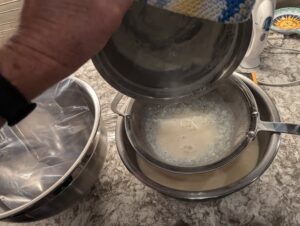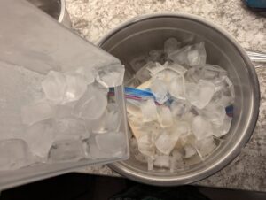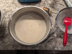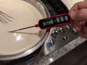 Cover with ice. Let sit until mixture cools to 40-50° F. Then use in ice cream recipe for the milk and eggs. One cup milk plus two eggs equals ~ 320 g.