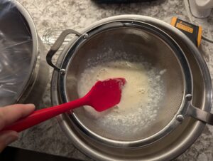 Some of the egg will be slightly cooked. Push it through the strainer with a spatula