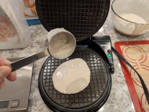 - Pour slightly less than ¼ cup per waffle cone into center of waffle iron. Let waffle iron sit open for 15 seconds, then close and latch lid.