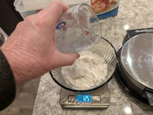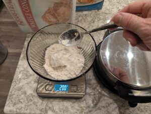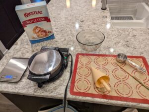 - Weigh correct amount of Krusteaz Waffle Cone Mix and water for the number of cones you want to make. Mix well with wire whisk to remove all lumps.