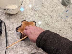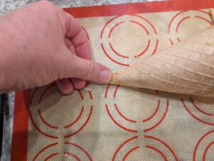 - Place cone form on waffle, with tip ~1/2 inch from one side of waffle. Roll the waffle around the cone form and hold down with the seam side down
